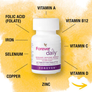 Forever Daily is a daily multivitamin and mineral supplement designed to support overall health and wellness. It provides a comprehensive blend of essential vitamins, minerals, antioxidants, and plant-based nutrients to promote immune function, energy levels, and general vitality. The formula is designed for optimal absorption and helps fill nutritional gaps in the diet for long-term health maintenance.