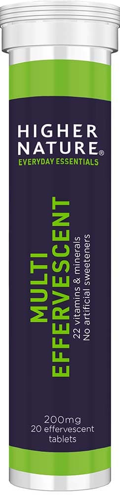 Higher Nature Multi Effervescent 20 Tablets provide comprehensive, whole-body support in a convenient, dissolvable form, ideal for those who prefer not to swallow capsules or tablets. Each fizzy, raspberry-flavored tablet delivers a blend of over 22 essential vitamins and minerals, including key nutrients like Vitamins C, D3, and E, as well as iron, zinc, magnesium, and calcium. This formula is designed to support enhanced vitality, energy levels, immune function, and the health of bones, skin, and hair. Committed to clean ingredients, this effervescent multivitamin is naturally sweetened, vegan-friendly, and completely free from artificial sweeteners, flavors, and preservatives. Simply dissolve one tablet daily in a glass of water for a tasty, nutrient-rich pick-me-up.