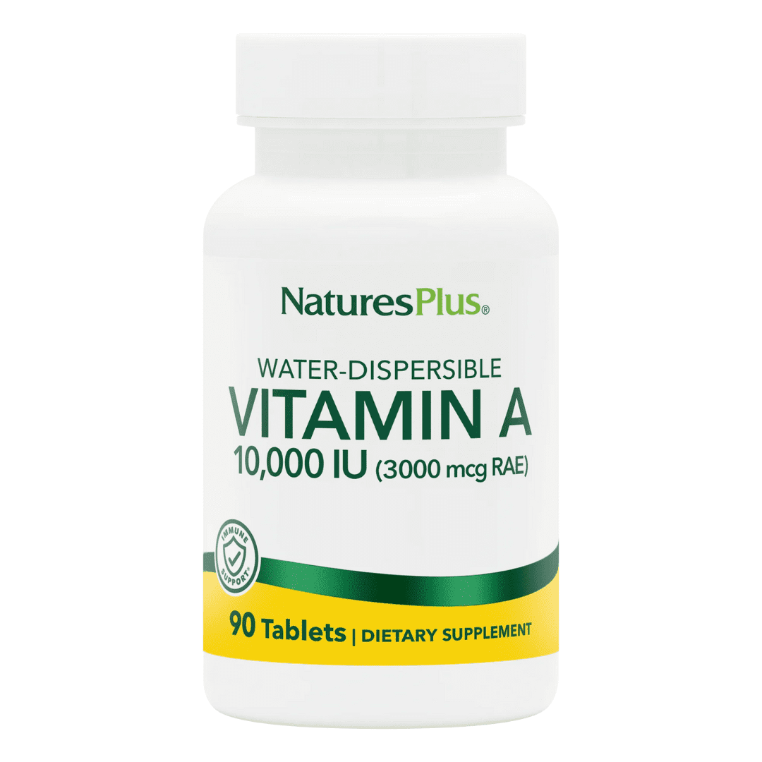 NaturesPlus Vitamin A 10,000 IU Tablets are a high-potency, water-dispersible dietary supplement designed to promote overall well-being. Each vegetarian, gluten-free tablet delivers 10,000 IU (3,000 mcg RAE) of Vitamin A (as palmitate) for optimal absorption, along with a botanical boost of lemongrass oil. This formula is intended to support healthy vision, a strong immune system, and skin health while also providing antioxidant protection against free-radical damage. Additionally, it helps maintain normal mucous membranes and supports the healthy metabolism of iron. As a dietary supplement, take one tablet daily.